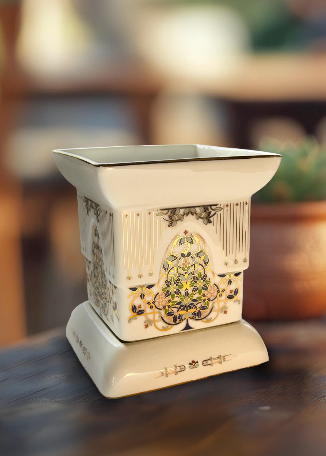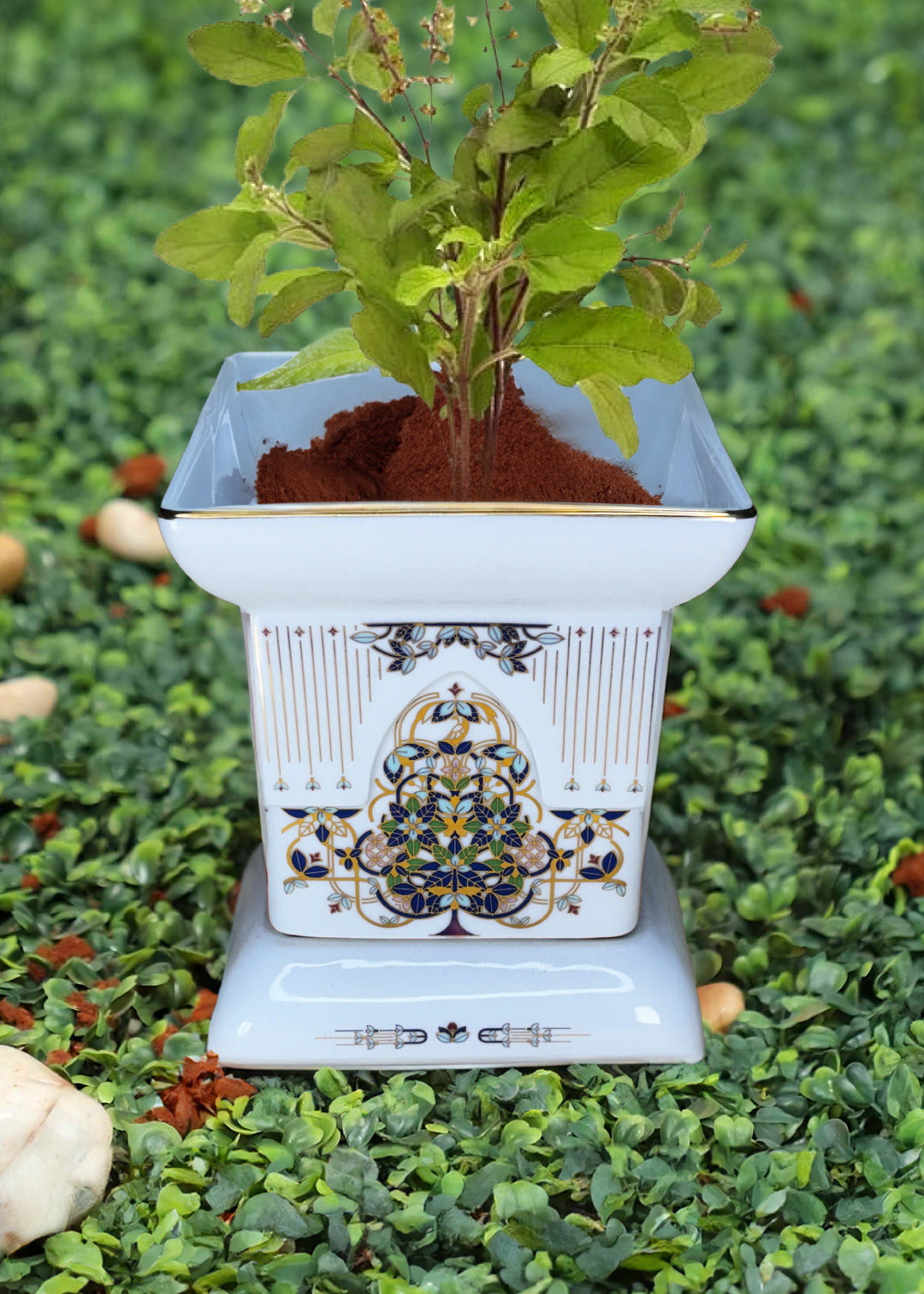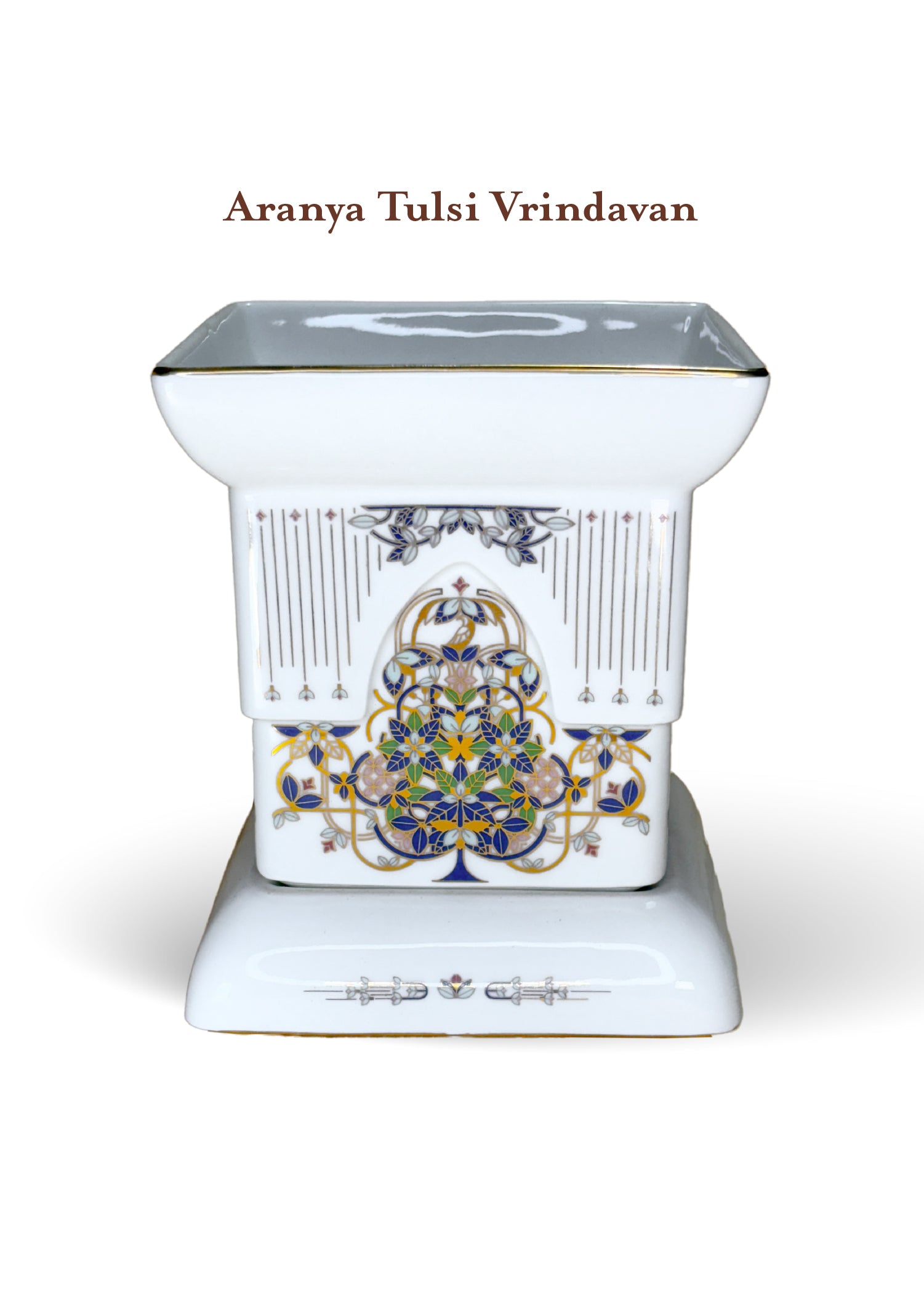 In many Indian homes, a beautiful tradition continues to this day; the worship of the Tulsi plant. As the first rays of the sun touch life on earth, people offer prayers, water and incense, to the venerable Tulsi that is usually nested inside a traditional planter. Our Aranya Tulsi Vrindavan, an exquisite porcelain tulsi planter pays tribute to this age-old tradition. Accentuated in gold, our Aranya Tulsi Vrindavan is a reminder of the importance of hope and faith, as it blesses every living space with positive energy.