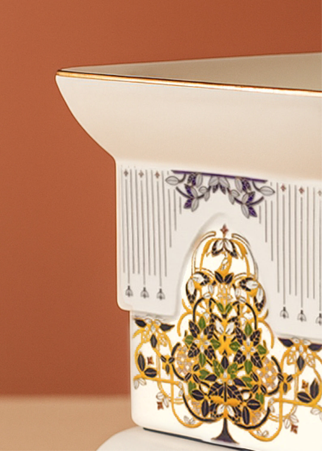 Adorned with intricate motifs, the Aranya Tulsi Vrindavan is reminiscent of a sacred forest. With delicate accents of gold, this tulsi planter pays tribute to magnificent creatures such as the deer and the eagle, and impressive trees like the Saal and the Ashoka. Aranya Tulsi Vrindavan is an exquisite porcelain planter that pays homage to the customary practice of worshipping the Tulsi plant.