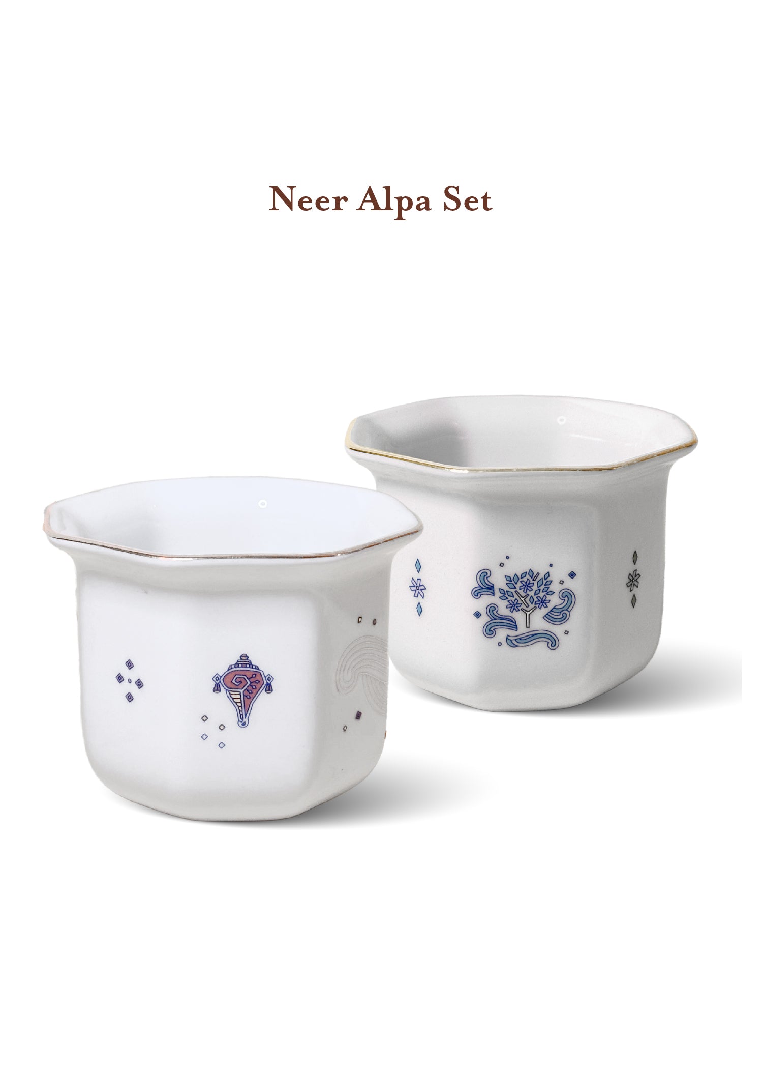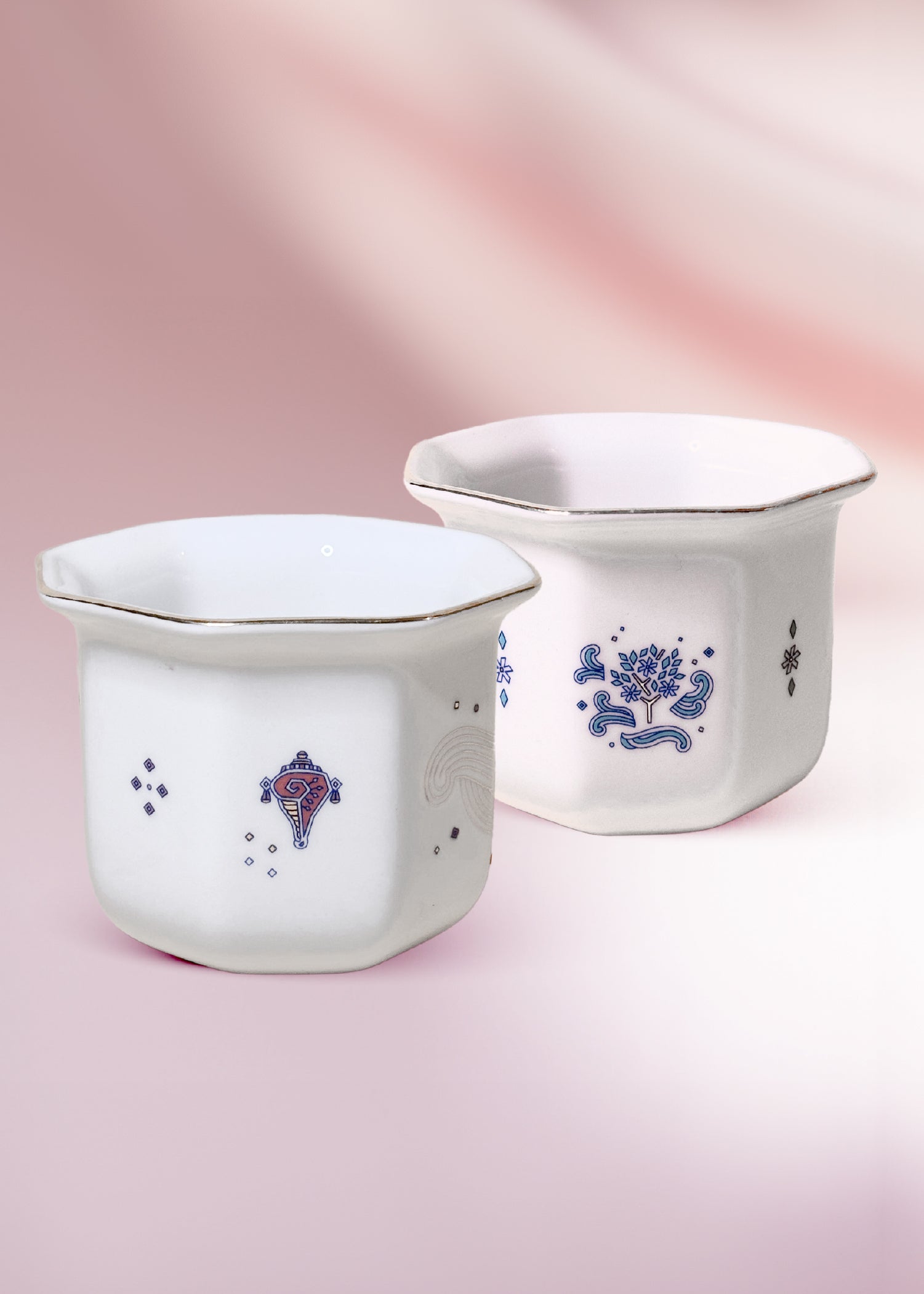 An elegant tumbler crafted in porcelain and bearing a delicate hem of gold, Manthan Tumbler is the perfect serveware you could ask for. Inspired by the great churning of the ocean - the Samudra Manthan, Manthan Tumbler comes in two discerning designs - Kalpavriksha and Shankha, both symbolic of the objects that emerged from the ocean. Crafted to suit every mood and occasion, it makes for a sublime wedding gift, a genial housewarming or festive gift for friends and family, as well as a great conversation starter.