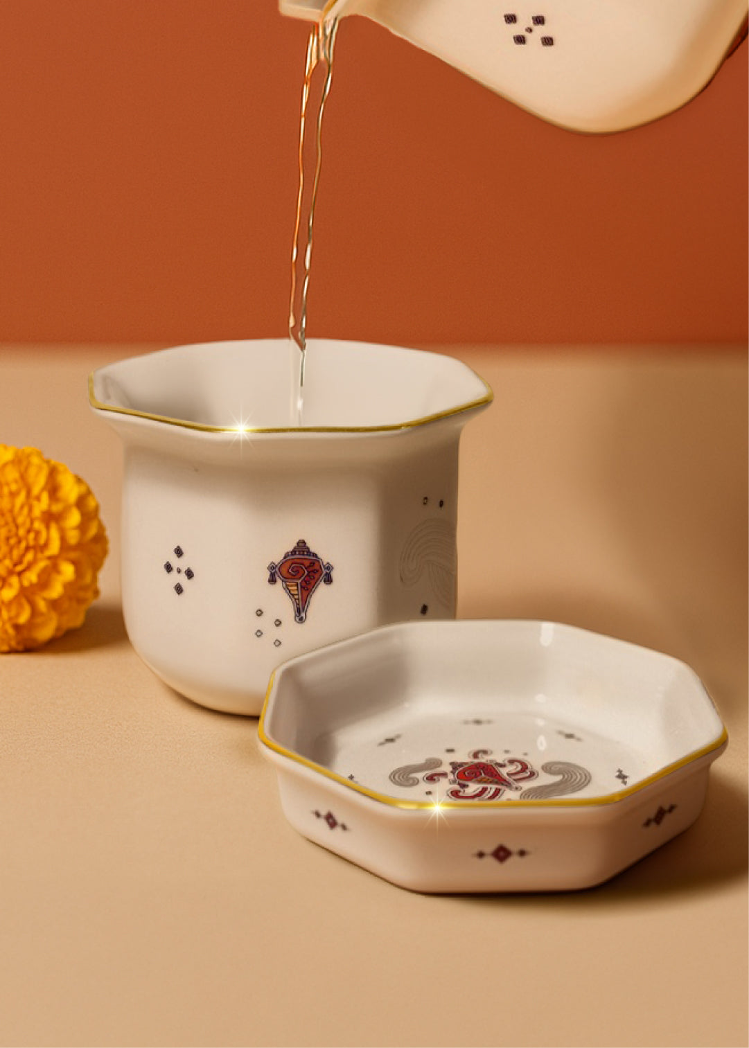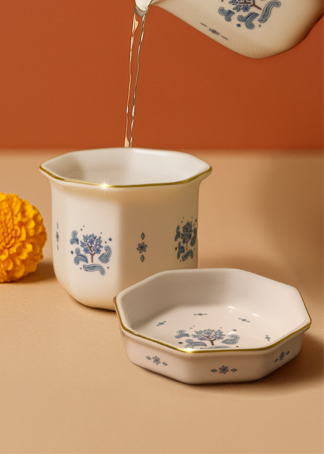 A blissful blend of form and flair, the Manthan Neer and Alpa is an elegant addition to every table setting. Inspired by the fabled Samudra Manthan, where the gods and demons danced the dance of desire and eternity, these exquisite porcelain pieces with intricate motifs and delicate gold accents add a touch of sophistication to every occasion. Available in two discerning designs - Kalpavriksha and Shankha, both symbolic of the objects that emerged from the ocean, Neer-Alpa makes for a sublime wedding gift, a genial housewarming or festive gift for friends and family.
