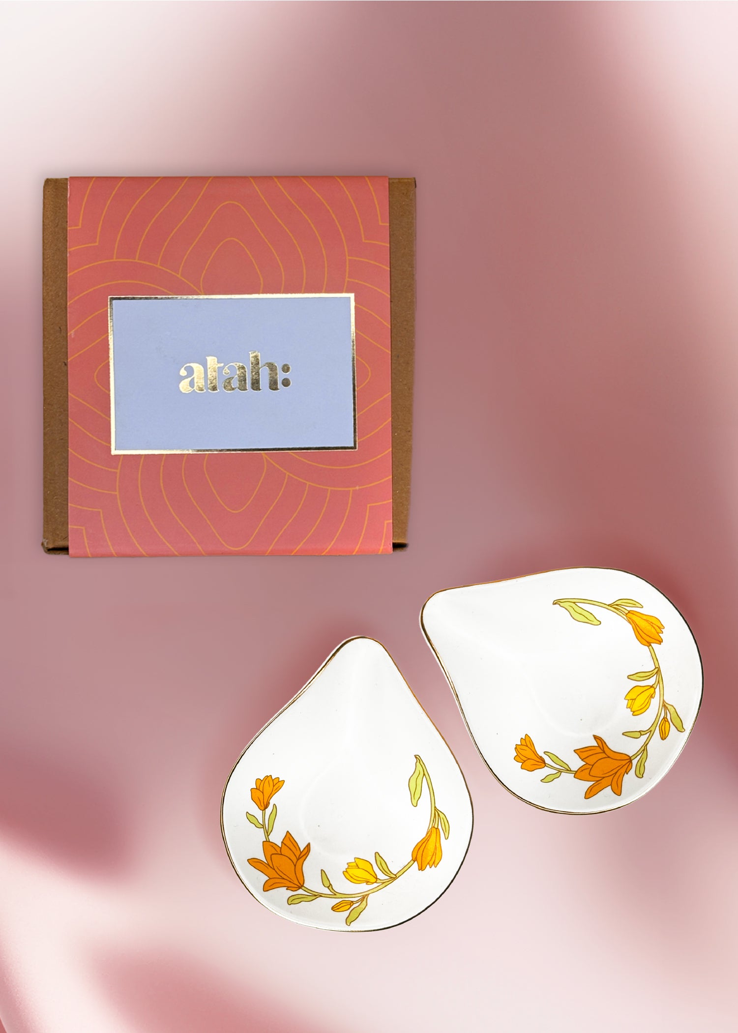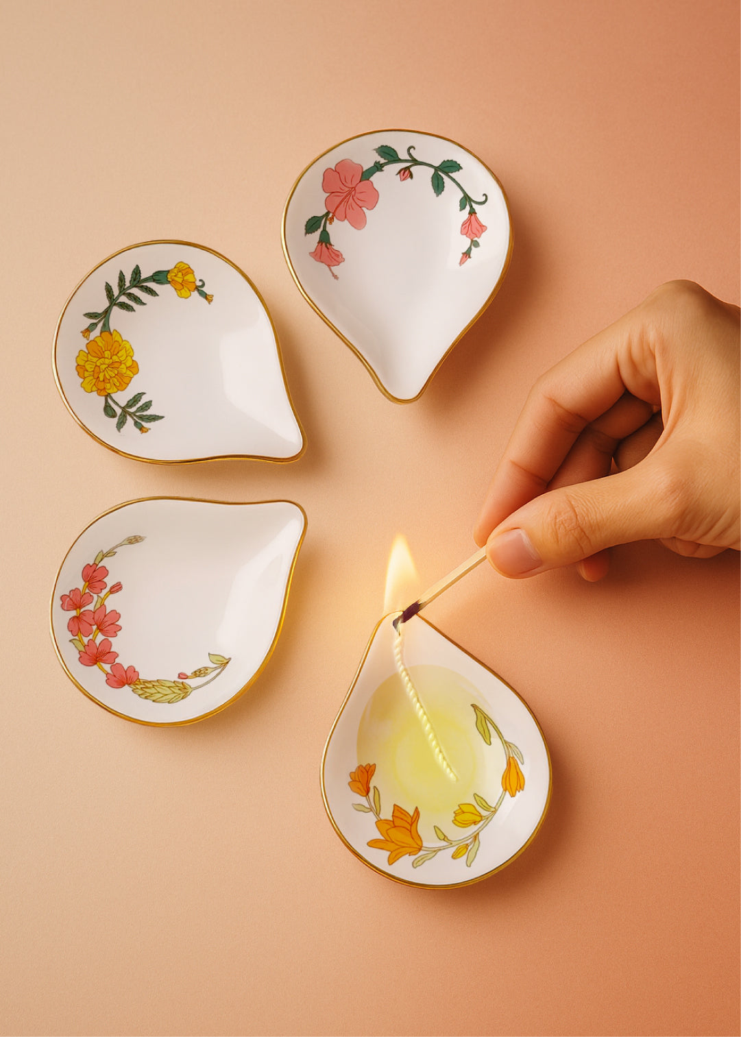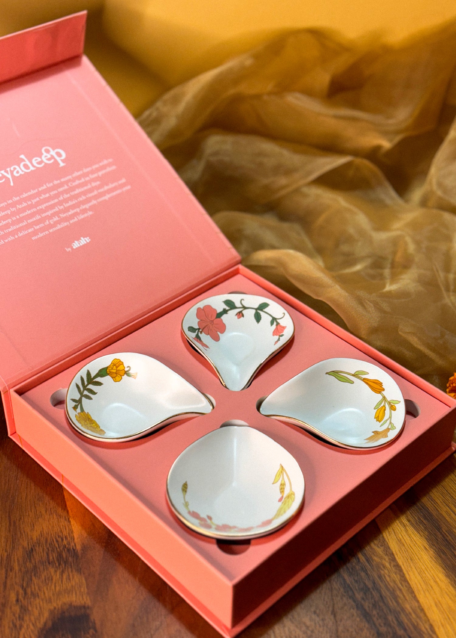 Neyadeep, a celebratory set of exquisitely crafted porcelain diyas, is inspired from our shared heritage of culture and our immense love for flowers. A tribute to India’s vibrant blooms, each diya is adorned with tranquil motifs in soothing pastels, reminiscent of cherished flowers like the marigold (gende ka phool), champak (son chapha), hibiscus and aboli. Each diya is accentuated with a sublime gold-plated hem that elicits an air of subtle elegance.