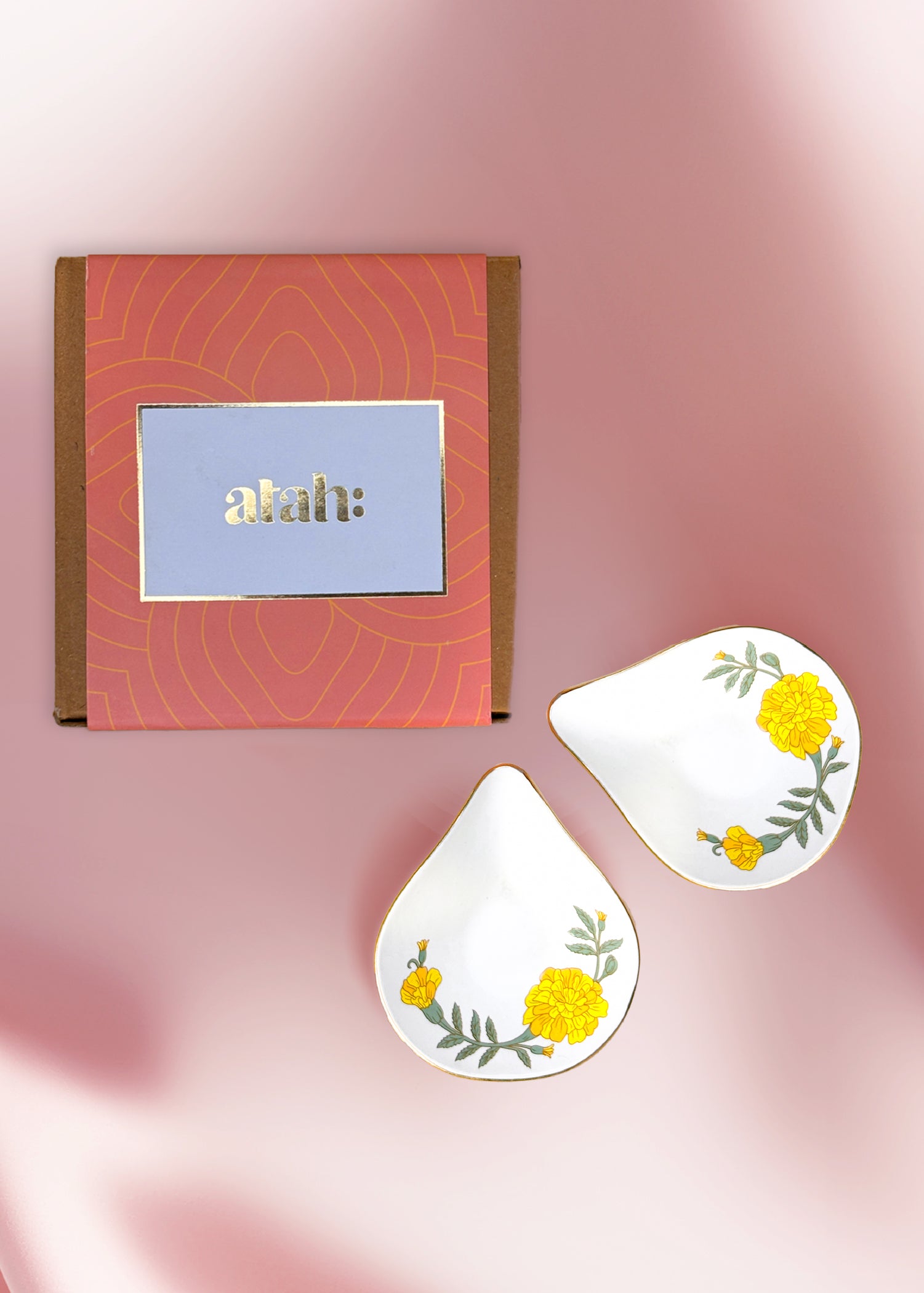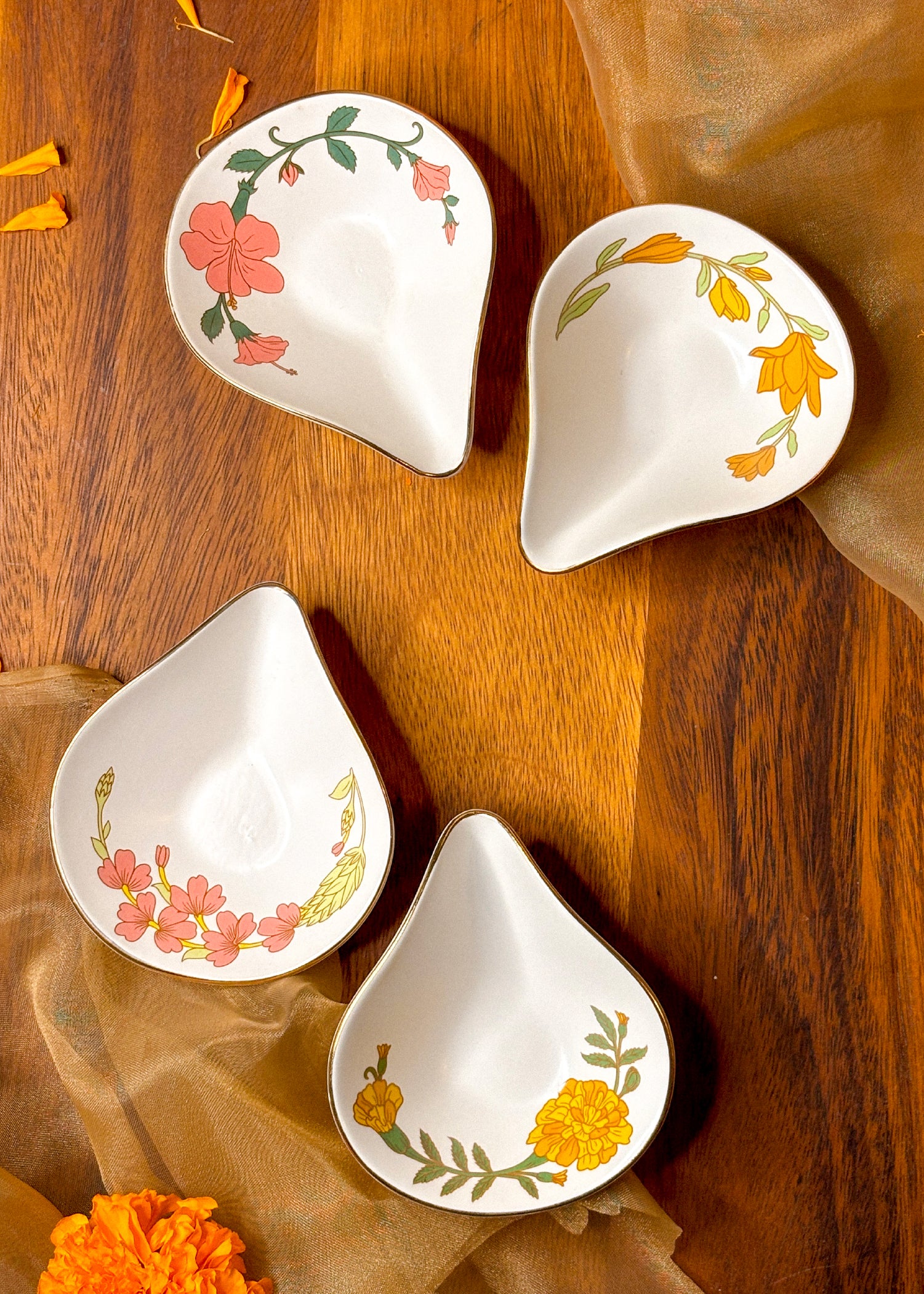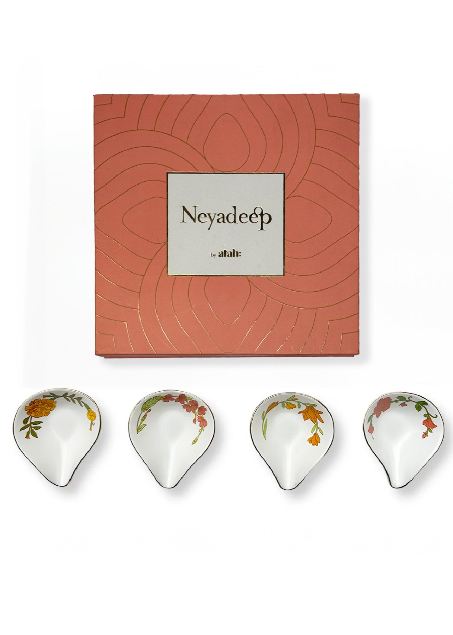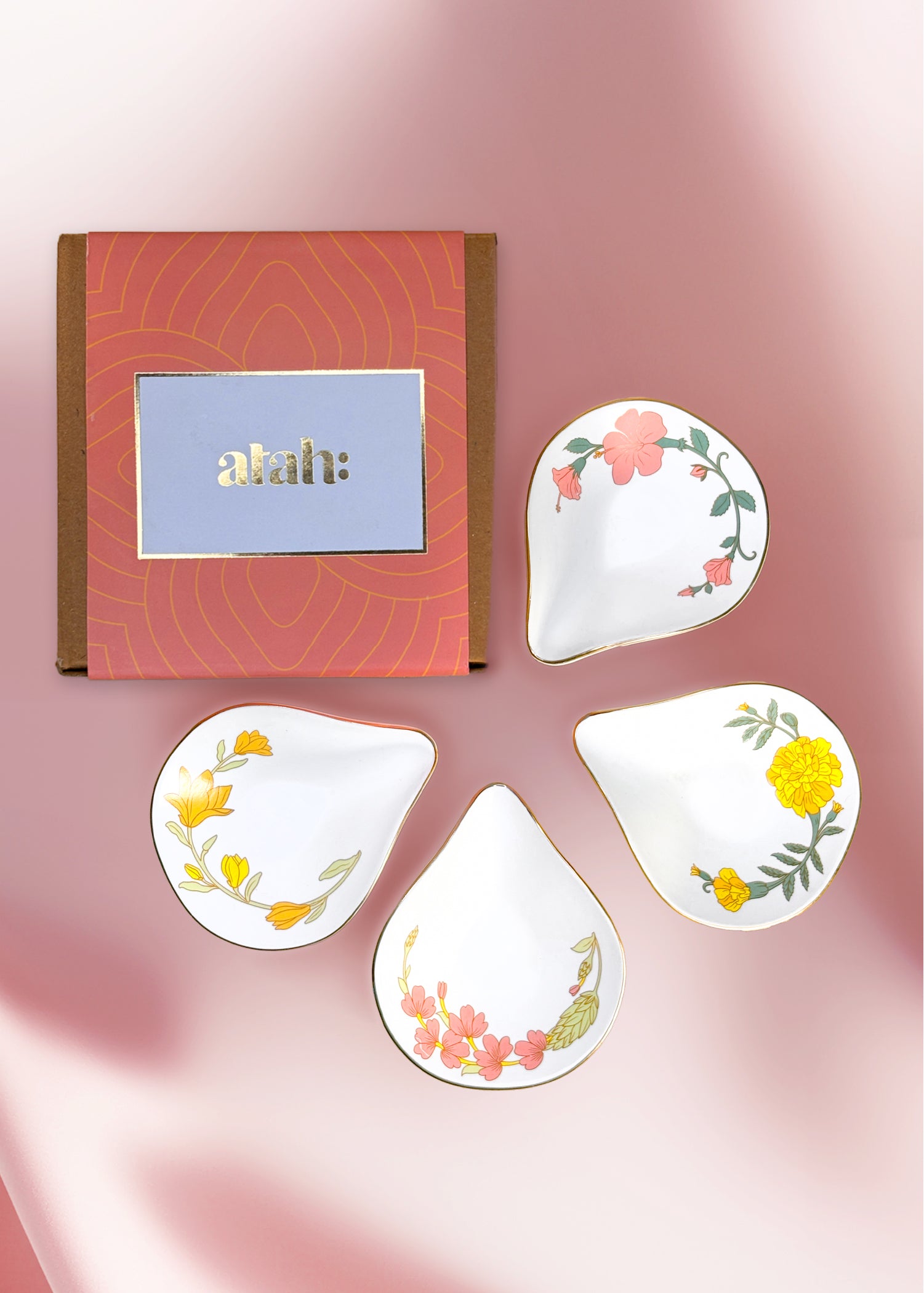 Neyadeep, a celebratory set of exquisitely crafted porcelain diyas, is inspired from our shared heritage of culture and our immense love for flowers. A tribute to India’s vibrant blooms, each diya is adorned with tranquil motifs in soothing pastels, reminiscent of cherished flowers like the marigold (gende ka phool), champak (son chapha), hibiscus and aboli. Each diya is accentuated with a sublime gold-plated hem that elicits an air of subtle elegance.