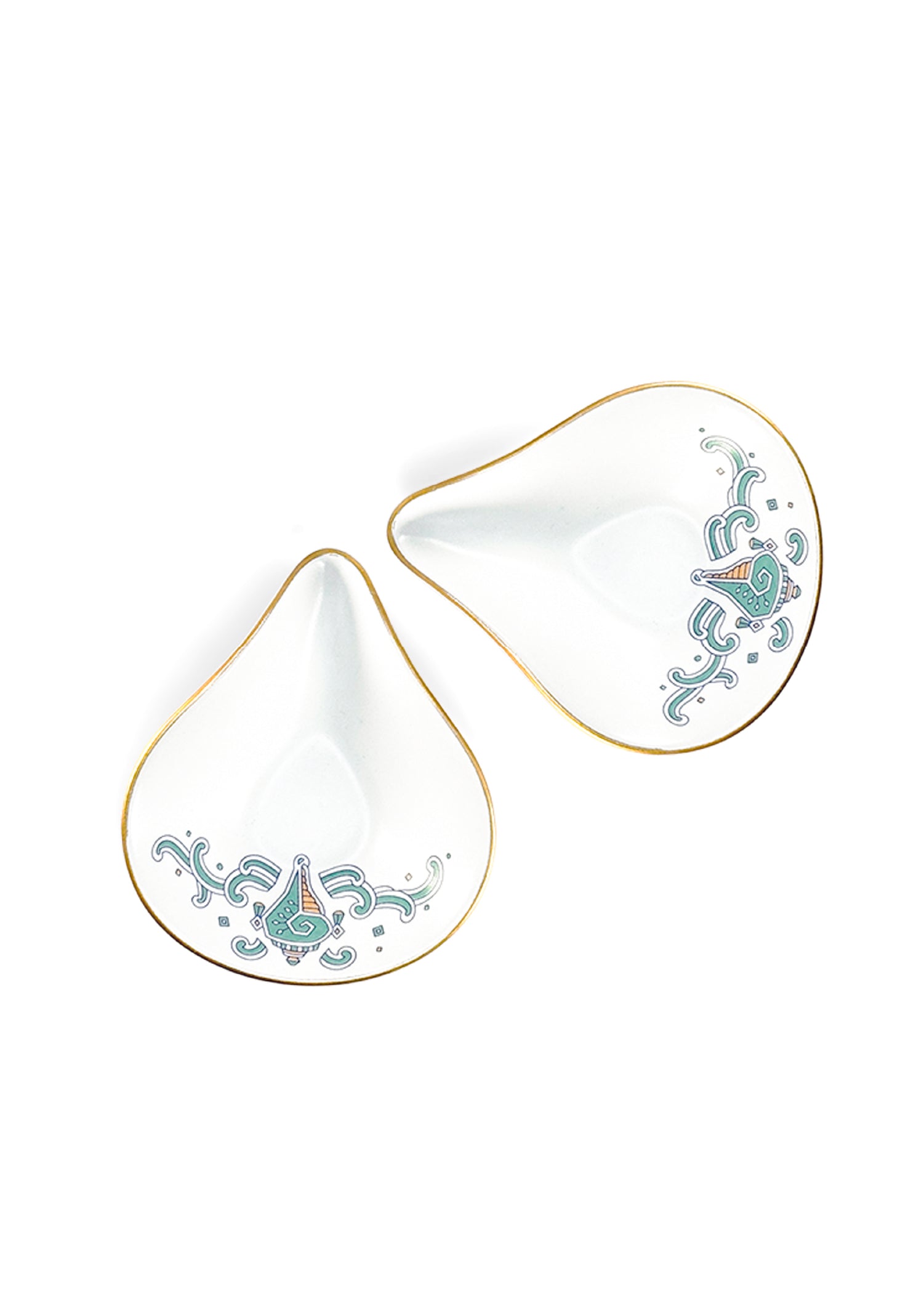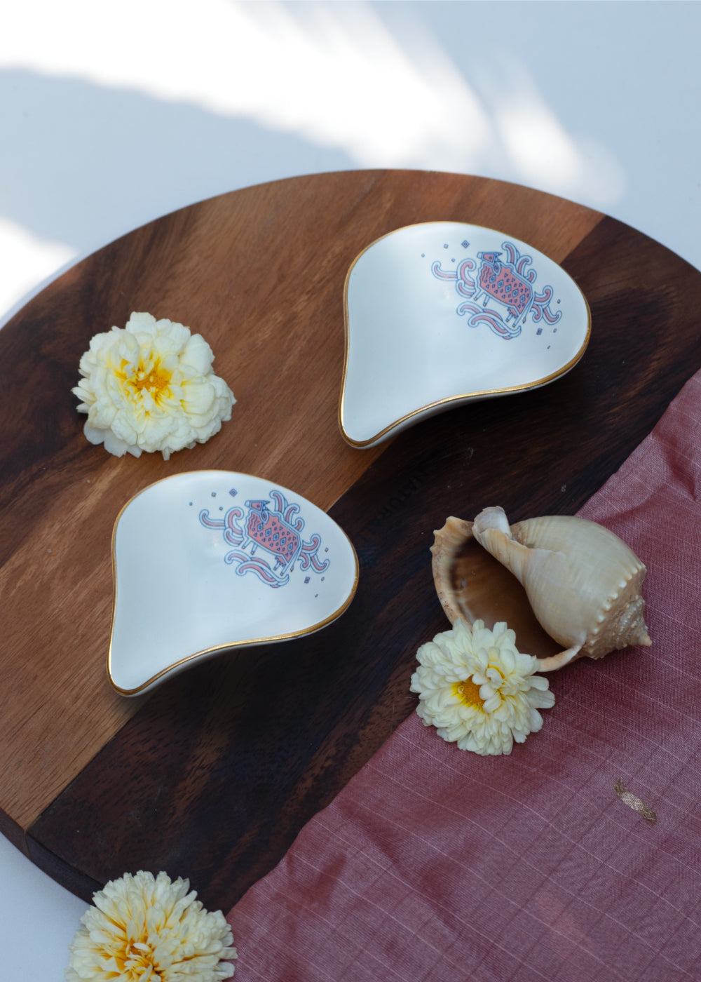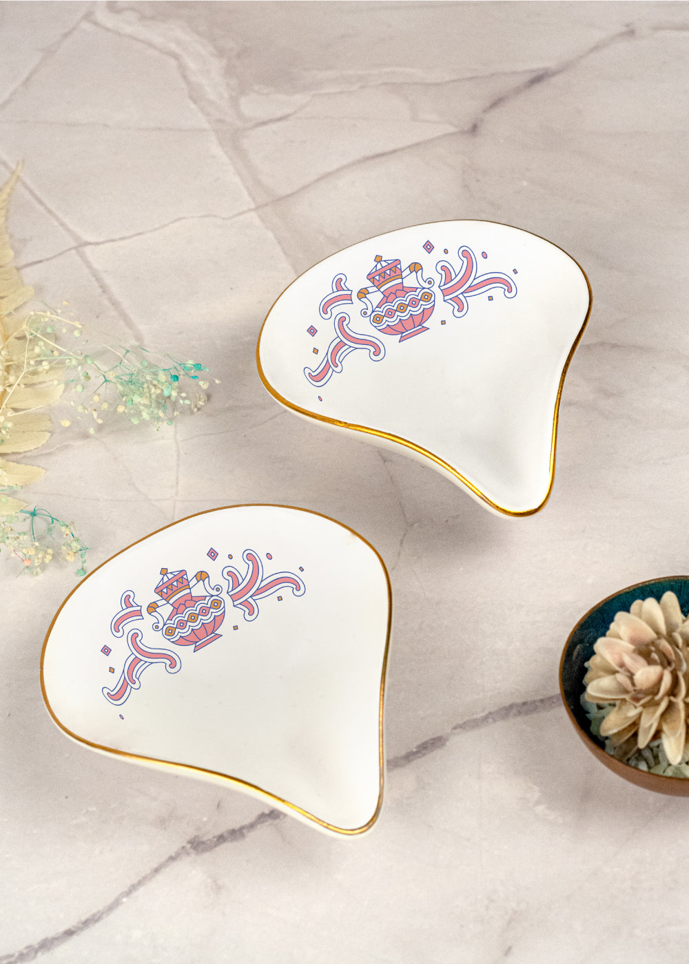 An ode to the great churning of the ocean from Indian mythology - the fabled Samudra Manthan, Neyadeep Manthan is a special edit by Atah and Locopopo, comprising two alluring pairs of porcelain diyas. Delicately crafted, with tranquil motifs that take inspiration from the ratnas or the marvellous treasures that emerged from the churning, Manthan celebrates a deep sense of collective culture and heritage, and is a re-imagination of the beginning of all things wonderful! Each diya is accentuated with a sublime gold-plated hem that elicits an air of subtle elegance.